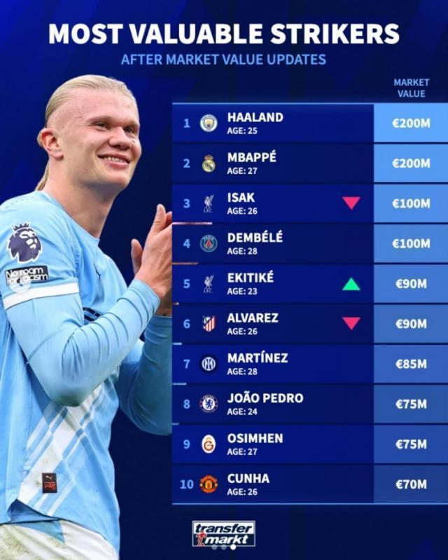 德转更新了足坛中锋身价情况,哈兰德和姆巴佩均两亿欧,伊萨克、登贝莱均1亿欧紧随其后。以下为足坛中锋身价榜top10: